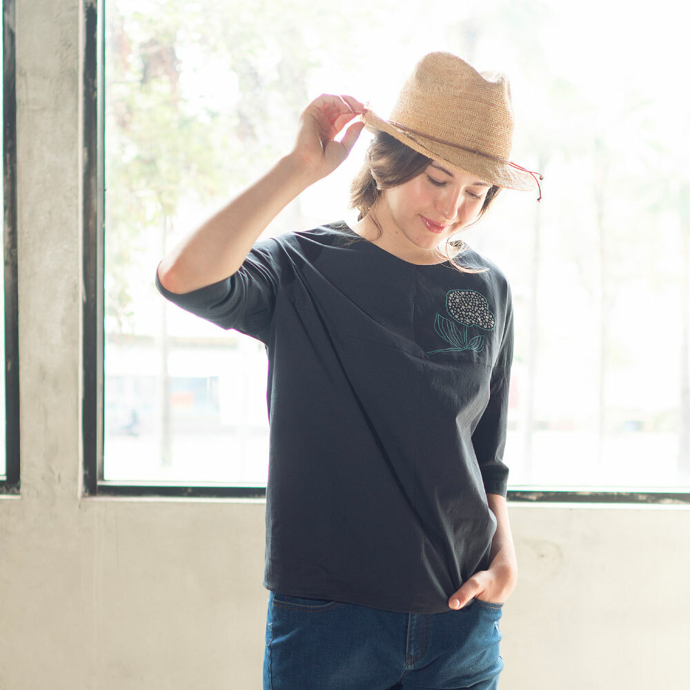 ◎胸前剪接線,拉高身材比例