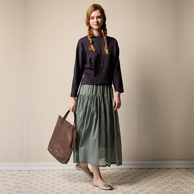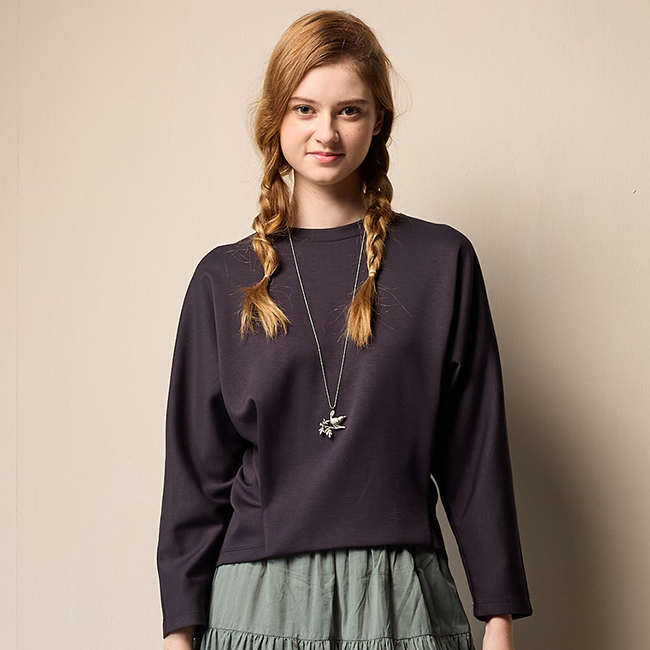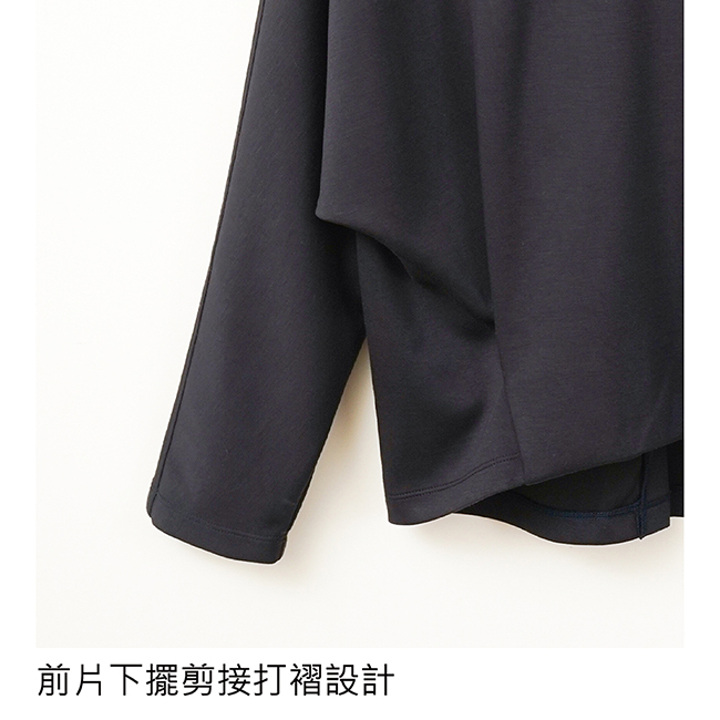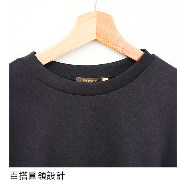 PIPPY 低調素面落肩下擺剪接圓領長袖上衣 藍